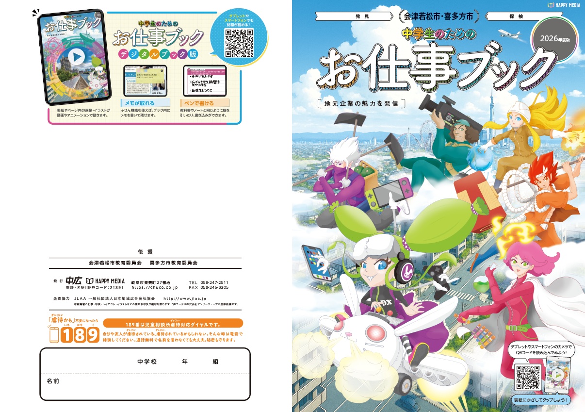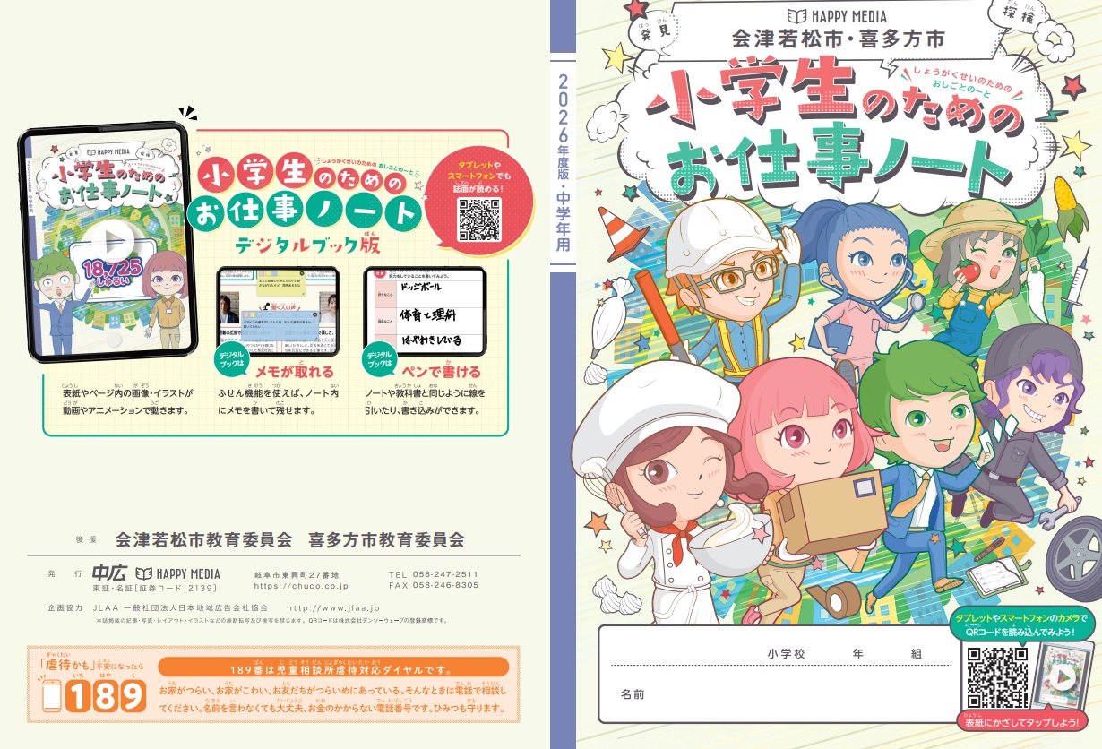 「中学生のためのお仕事ブック」は会津若松市と喜多方市の中学2年生を対象に、「小学生のためのお仕事ノート」は両市の小学3・4年生を対象に配布される教材です。